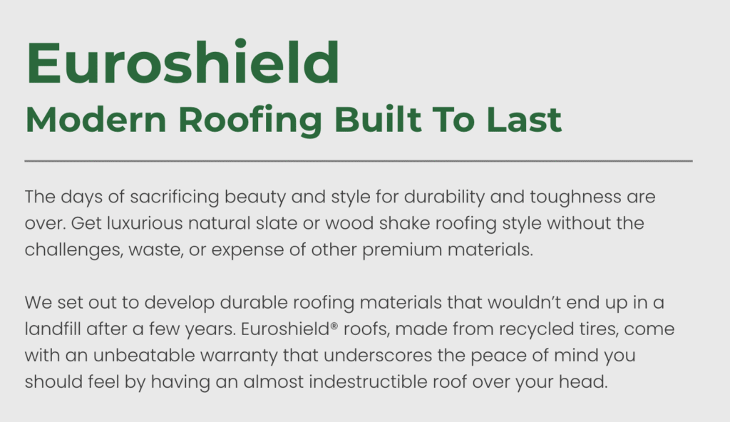 It’s Affordable- Euroshield® products provide great long-term value over their lifecycle. The average Euroshield® roof will cost you less than a cup of coffee per day due to its long life span, superior performance, and resiliency.